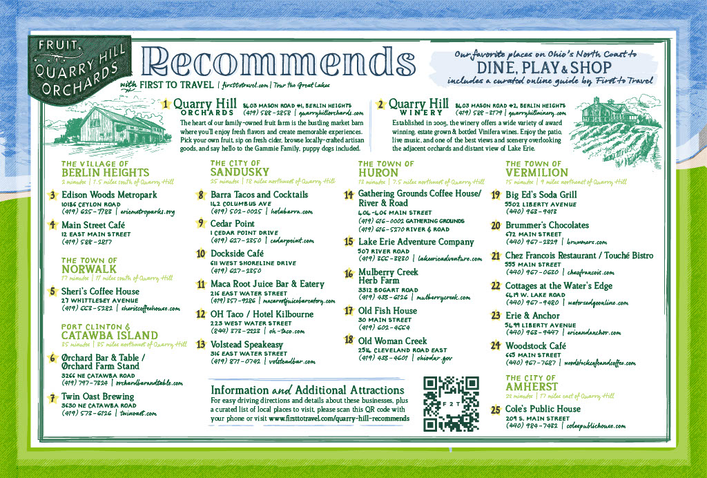 We’ve been asked time and time again for the next best place to explore after enjoying some time on the farm. We’ve partnered up with First to Travel (and some of the best area small businesses) to create the “Quarry Hill Orchards Recommends” resource to help guide your continued five start experience along your journey to (and from) the farm.